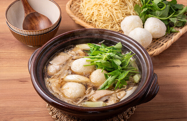 つぶしたあきたこまちをだんご状に丸めてつくるだまこ。比内地鶏中華そばに付属のスープと野菜を入れればあっという間に完成。〆には残ったスープに麺を入れて。