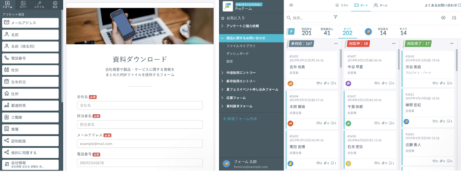フォーム作成時には、「お問い合わせ」「申し込み」「アンケート」など40種類のテンプレートから適したものを選択し、ドラッグ&ドロップやテキストの入力だけで、誰でも簡単にビジュアル豊かなフォームをノーコードで作成できます。また、フォームの回答をカンバン方式で管理し、顧客対応状況を可視化できます。それぞれの回答に対し、メール送信や対応した担当者の設定が可能なため、チームで効率的にフォームへの回答を管理できます。