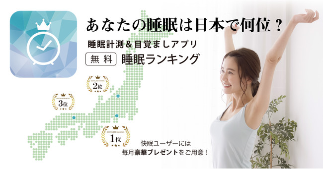 目覚ましアラームとして使用することで、いびきの有無、就寝・起床リズム、美容、肥満予防など8つの評価項目を睡眠スコアとして100点満点で採点し、一晩の睡眠の質を分かりやすく見える化します。日々の睡眠の質を点数化した睡眠スコアは、ランキング化してアプリ内で発表され、全国ランキング上位の方には豪華睡眠グッズがプレゼントされる無料携帯アプリです。
