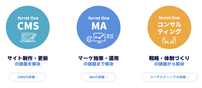 『ferret One』は、BtoB企業がマーケティング活動を行う上でのお困りごとを、まるっと解決していくBtoBマーケティングサービスです。「今のマーケティング活動をもっと効率的に運用したい」「マーケティング活動を始めたいがどのように進めたら良いかわからない」。そんなBtoBマーケティングのお困りごとを『ferret One CMS』『ferret One MA』『ferret One コンサルティング』の3つのラインナップで、戦略設計、サイト構築、マーケティング運用の効率化、ツール提供など、あらゆるプロセスから解決していきます。
