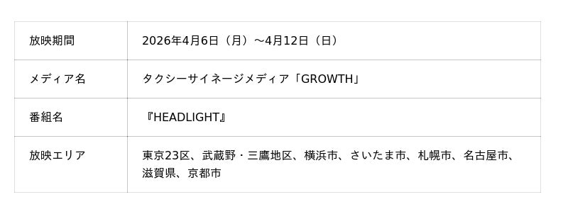 2026年4月6日(月)より、東京23区を中心としてタクシーサイネージメディア「GROWTH」内の番組「HEADLIGHT」にてPR動画を放映しております。『S.RIDE』『DiDi』の連携タクシーにてご覧いただけます。