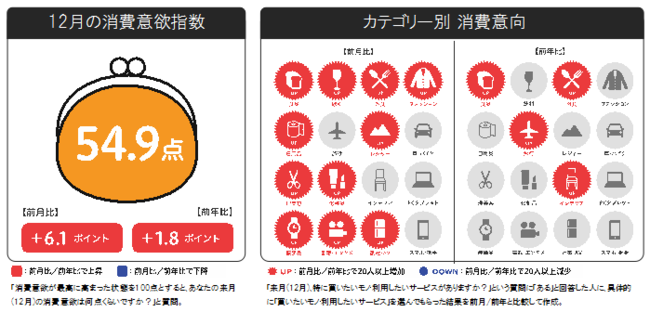 12月の消費意欲指数は54.9点。前月比は+6.1pt、前年比は+1.8ptと、いずれも上昇しました。