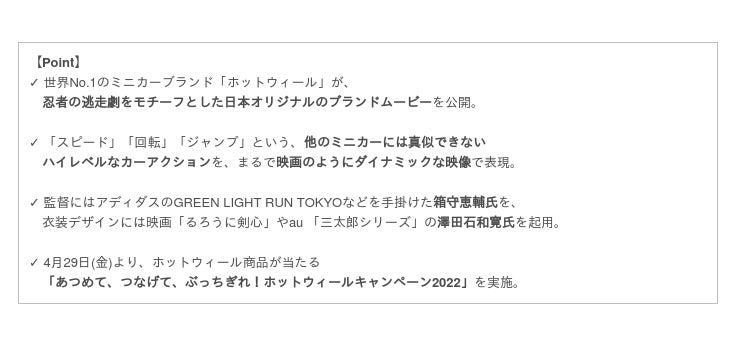 世界大手の玩具メーカー、米国マテル社の日本法人であるマテル・インターナショナル株式会社(本社:東京都千代田区、代表取締役社長:マーク・パンサール)は、販売台数世界一のダイキャストカーブランド「ホットウィール」の日本オリジナルブランドムービーを4月25日(月)より公開します。動画の公開を記念し、4月29日(金)より豪華ホットウィール商品が当たる「あつめて、つなげて、ぶっちぎれ!ホットウィールキャンペーン2022」を実施します。