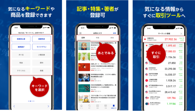 日経平均やNYダウ平均などの主要株価指数や為替など、マーケット情報も閲覧できるようになりました。さらに、記事内の国内株式の銘柄やマーケット情報をクリックすると、スマートフォン向け株式トレーディングアプリ「iSPEED(R)」に移動し、銘柄の詳細情報の確認、取引が可能になります。