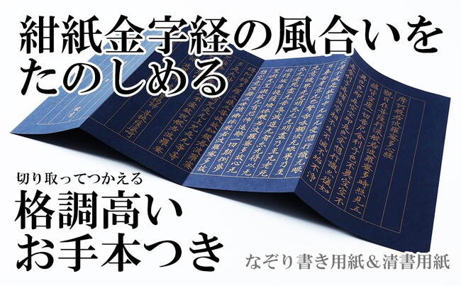 切り取ってつかえる、格調高い「紺紙金字経」風お手本で写経を楽しみましょう。