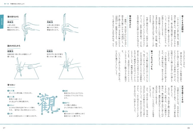 大きな文字でひとつひとつポイントをおさえて、なぞり書きで形をつかんだら、写経スタイルで練習する仕組み。はじめての人でも安心です。