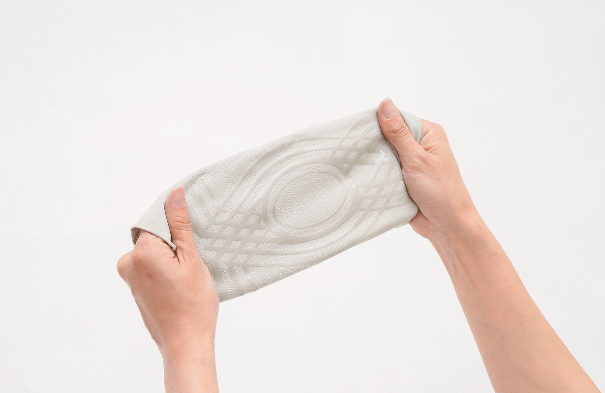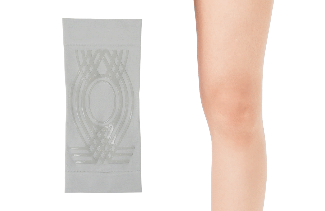 プリントされたシリコンが、まるで「ひざを補助する筋肉」となり、ひざ関節の動きをサポートしてくれます!