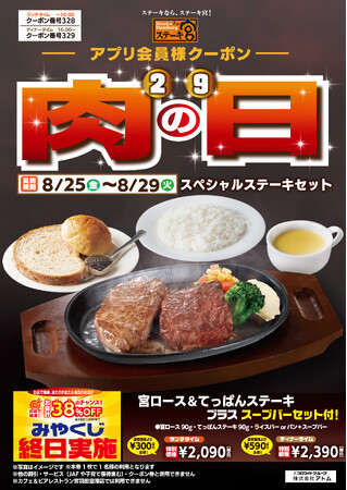 コロワイドグループの株式会社アトム(本社:神奈川県横浜市、代表取締役社長:小島保幸)は、「ステーキ宮」各店で、2023年8月25日(金)から、2023年8月29日(火)までの5日間「肉の日スペシャルステーキセット」をアプリ会員とTwitterフォロワー限定で販売いたします。