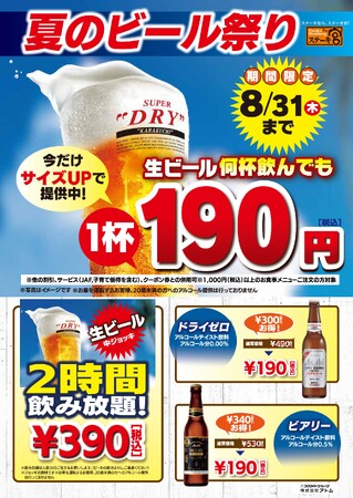 更に更に8月31日まで、生ビール(中)が2時間飲み放題で390円(税込)通常価格590円(税込)が190円(税込)の「夏の生ビール祭り」開催中!