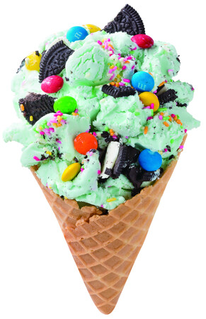 爽快感のあるオリジナルミントアイスクリームに、エム&エム(R)、オレオ(R)クッキー、レインボースプリンクルをミックス。見た目もPOPで、まるでお菓子のようなアイスクリームで、食べ進めるたびに様々な味や食感を楽しめる・ワクワクする人気商品です。