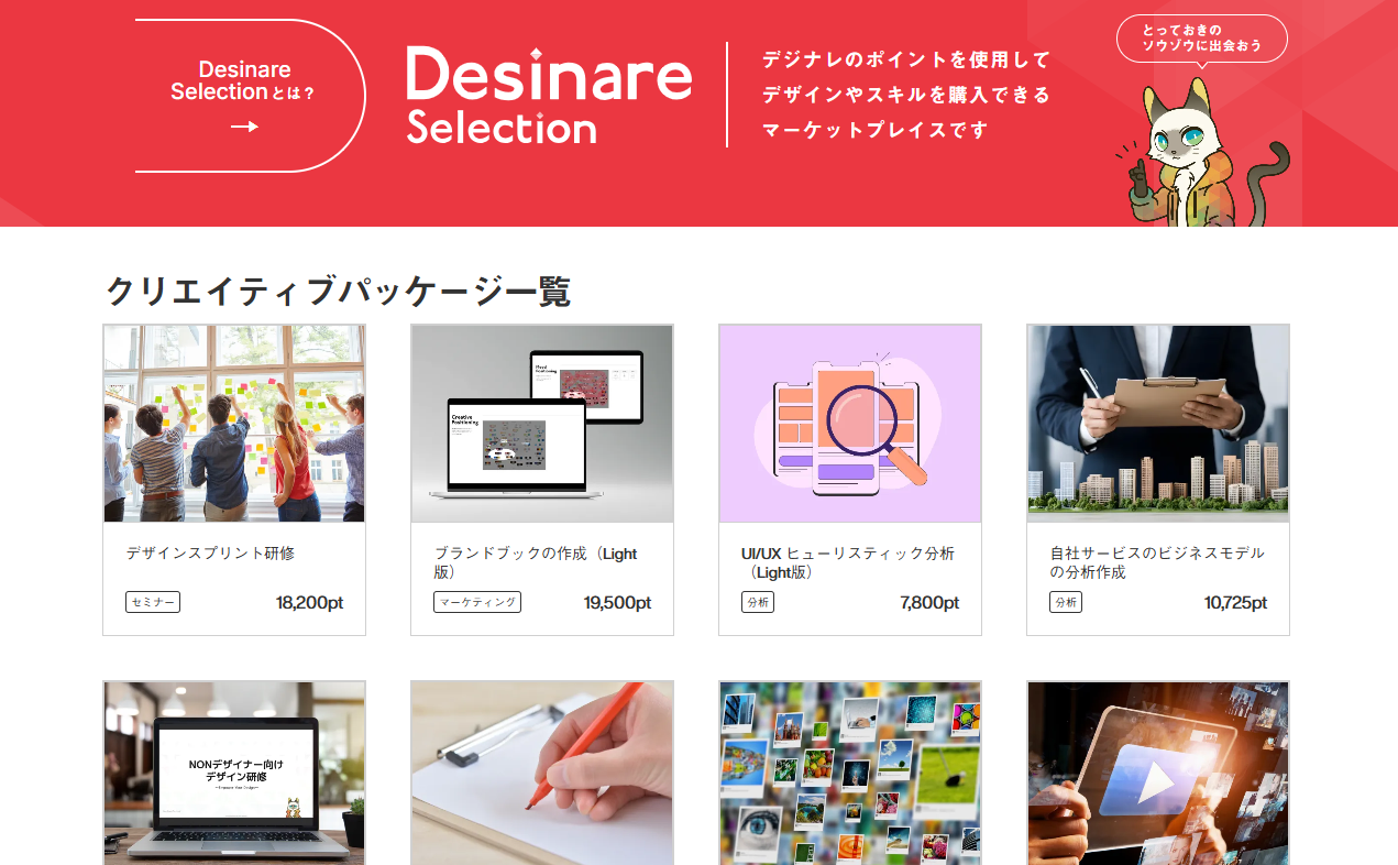 「Desinare Selection(デジナレ セレクション)」は、デザインやスキルを購入できるマーケットプレイス機能です。ネクスキャットのフルスタックデザイナーが実務で培った経験やスキルをパッケージ化し、ポイント制でご購入いただけます。主な商品・サービスは以下の通りです。
