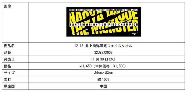 ミズノは、12月13日(火)に行われる主要ボクシング4団体王座統一戦に日本人で初めて挑む井上尚弥選手の応援企画として、オリジナルTシャツ、フェイスタオル、ジャージ上下セット、スニーカーをミズノ公式オンライン、MIZUNO TOKYO※で11月30日(水)に発売します。