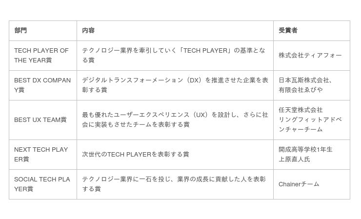 記念すべき第1回のグランプリにあたる「TECH PLAYER OF THE YEAR賞」は、自動運転用のソフトウェア「Autoware」をオープンソース化し、自動運転に関わるあらゆる領域の進化を加速させた株式会社ティアフォーが受賞。「BEST DX COMPANY賞」は日本瓦斯株式会社と有限会社ゑびや、「BEST UX TEAM 賞」は任天堂株式会社 リングフィット アドベンチャーチーム、「NEXT TECH PLAYER賞」は開成高等学校1年生の上原直人氏、「SOCIAL TECH PLAYER賞」はChainerチームがそれぞれ選出されました。