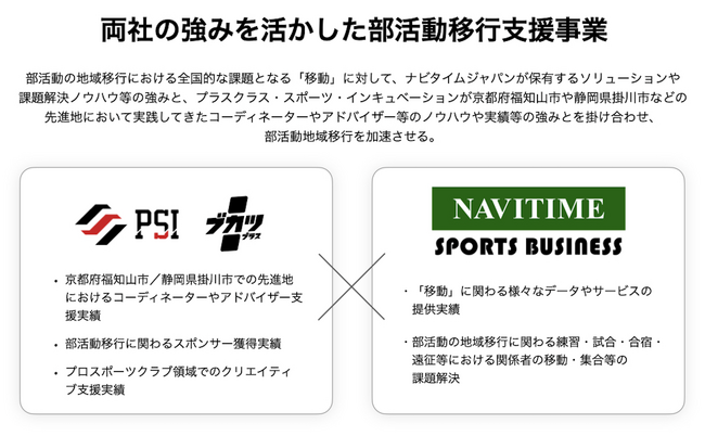 株式会社ナビタイムジャパン(代表取締役社長:大西 啓介、本社:東京都港区)は、プラスクラス・スポーツ・インキュベーション株式会社の部活動移行事業「ブカツプラス」との連携を開始します。