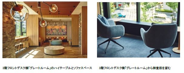 3階フロントデスクはポップなカラーと落ち着いたデザインを組み合わせ、より明るく、ゲストをお迎えする空間として生まれ変わりました。フロントデスク横の「グレートルーム」は、御堂筋の大通りを望む窓際のハイテーブルやアートワークに囲まれたソファスペース、また作業がしやすい大きなテーブルがあり、すべての席に電源が完備され、お仕事でも、自由なくつろぎの時間にも、ゆったり過ごす空間としてもご利用いただけます。ワインやサイダー、ネスプレッソコーヒー、スナックもセルフサービス式でご用意(有料)があり、コーヒーを飲んで寛いだり、旅の計画を立てたり、思い思いにお過ごしいただけます。