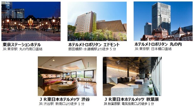 ホテル施設: 「東京ステーションホテル」「ホテルメトロポリタン エドモント」「ホテルメトロポリタン 丸の内」「JR東日本ホテルメッツ 渋谷」「JR東日本ホテルメッツ 秋葉原」