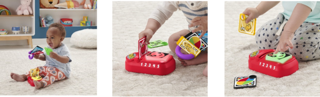 大人気のカードゲーム「UNO」をモチーフにした知育玩具です。ワイルドカードや、1〜4の数字が書かれたカードをそれぞれ差し込んでスキャンすると、動物や果物の名前、色や数を日本語と英語で教えてくれます。カラフルなライト、ゆかいな音や歌などで五感を刺激します。