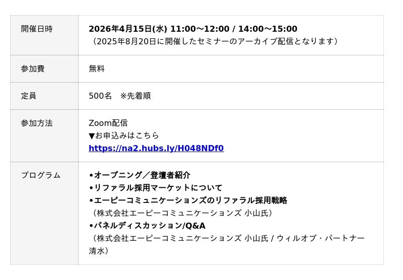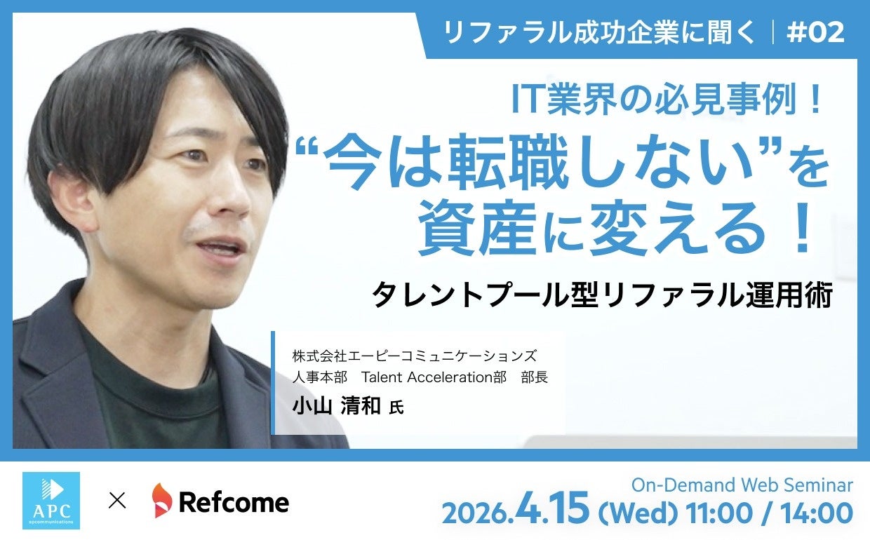 ウィルグループのリファラル採用を活性化させるクラウドサービス「Refcome(リフカム)」を提供する株式会社ウィルオブ・パートナー(本社:東京都新宿区、代表取締役社長:清水 巧)は、無料オンラインセミナー「IT業界の必見事例!“今は転職しない”を資産に変える!タレントプール型リファラル運用術 【アーカイブ配信】」を2026年4月15日(水)に開催します。