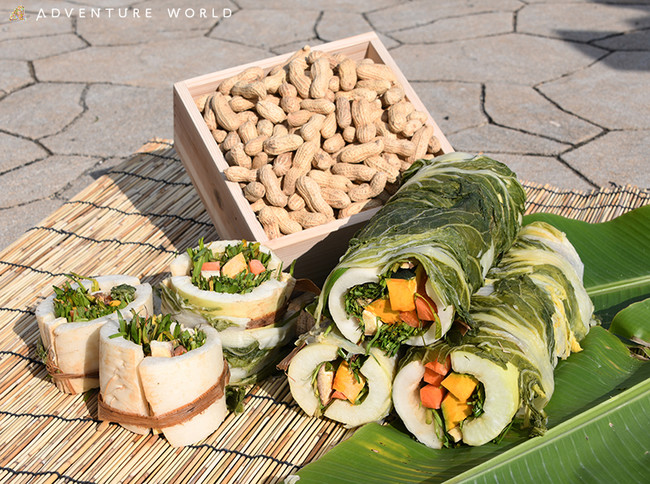 アフリカゾウへプレゼントするスタッフ特製の『恵方巻』には、好物の野菜をふんだんに使用するほか、ジャイアントパンダが食べ残した竹の葉や、マレーバクが食べ残した樹木の枝など、パークで暮らす動物たちからの“おすそわけ”を使用しています。また、ゲストの皆様からマントヒヒへ「福は内!」の掛け声に合わせ福豆をプレゼントしていただきます。