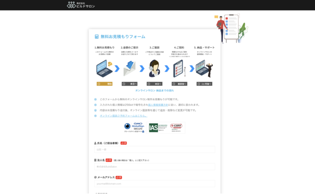 ビルドサロンの無料お見積もりフォーム( https://buildsalon.co.jp/estimate )にアクセスし、必要項目を埋めて送信してください。