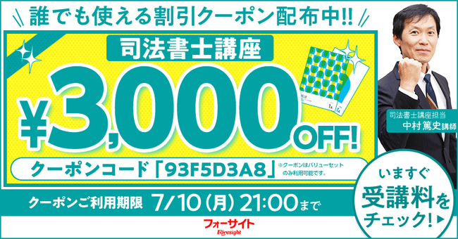 高い合格率を実現する株式会社フォーサイト(東京都文京区/代表取締役社長:山田 浩司)は、2023年6月30日(金)より司法書士講座の誰でも使える割引クーポンを配布中です。
