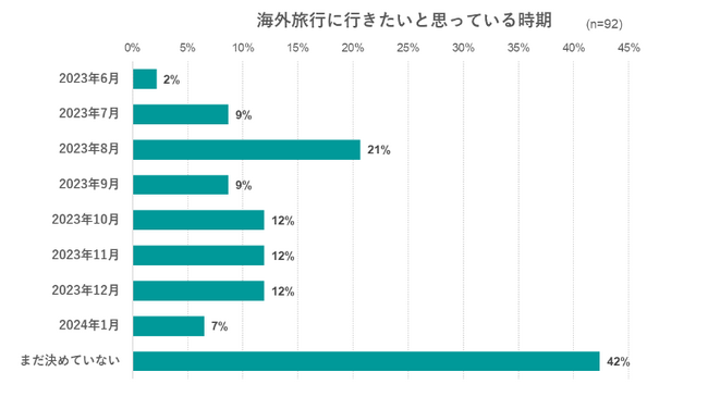 時期が決まっている人では、「2023年8月」と回答した人が21%と最も多く、「2023年7月」という回答が9%と合わせると約3割の人が今夏に海外旅行を考えているということがわかります。
