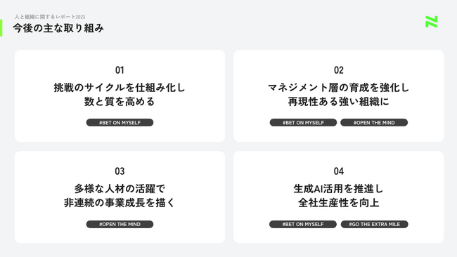 人材が最大限に活躍できる環境を作り出すための取り組みは、今後も中長期で注力する予定です。あらゆる才能を活かし、挑戦と学びを大切にするカルチャーを醸成しながら、組織づくりを行ってまいります。