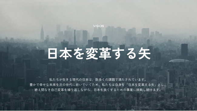 豊かで幸せな未来を次の世代に紡いでいくため、私たちは自身を「日本を変革する矢」とし、絶え間なき自己変革を繰り返しながら、日本を良くするための事業に挑戦し続けたいという思いから、改めて新しいビジョンを策定いたしました。