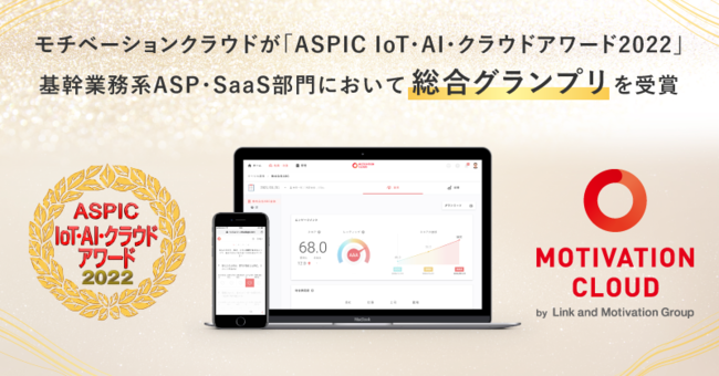 株式会社リンクアンドモチベーション(本社:東京都中央区、代表:小笹芳央、証券コード:2170、以下当社)は、当社の「モチベーションクラウド」が、一般社団法人日本クラウド産業協会(ASPIC)主催の「第16回ASPIC IoT・AI・クラウドアワード2022」(主催:一般社団法人日本クラウド産業協会、後援:総務省他)の基幹業務系ASP・SaaS部門において総合グランプリを受賞しましたことを、下記の通りお知らせいたします。