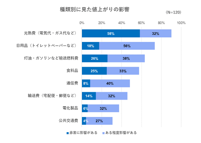次に多かったのは「日用品(トイレットペーパーなど)」で、「非常に影響がある」(18%)、「ある程度影響がある」(56%)と7割を超えています。さらに「灯油・ガソリンなど輸送燃料費」の影響も6割を超え、「食料品」を上回る結果となりました。