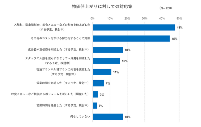 「入場料、駐車場料金、飲食メニューなどの料金を値上げした(する予定、検討中)」が48%と、約半数もの施設が「料金の値上げ」で対応しています。