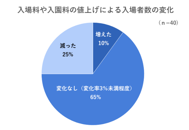 「減った」が25%、「変化なし(変化率3%未満程度)」が65%と、値上げがあっても入場者数は変わっていないという施設が多いことがわかりました。また、「増えた」という回答も1割程見られました。