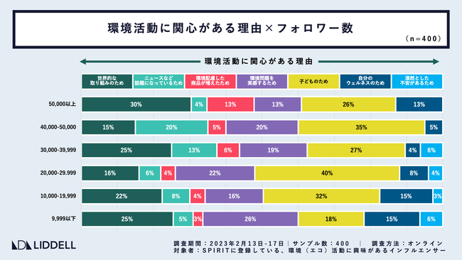 フォロワー数別では、「50,001フォロワー以上の層」で「世界的な取組のため」が30%と最も多く、環境活動に対して視座が高いことが明らかになりました。