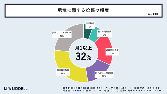 「環境に関する投稿の頻度」について質問したところ、「ほぼ毎日」が6%、「週に1-2回程度」が7%、「月に数回程度」が19%となり、「月1回以上」は32%という結果となりました。