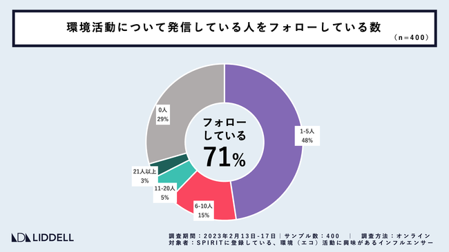 「SNSで環境活動について発信している人をフォローしている数」について質問したところ、「1-5人」が48%、「6-10人」が15%、「11-20人以上」が5%、「21人以上」が3%という結果となりました。
