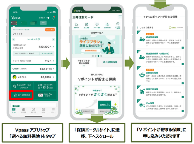 Vpass アプリなどからシームレスに利用できる「保険ポータルサイト」や、「Vポイントが貯まる保険」の