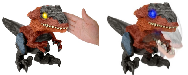 頭やあごの下にあるセンサーに反応して動くピロラプトルのフィギュアです。飼いならされる前の状態であるワイルドモードや、ピロラプトルの命令に従って遊べるプレイモード、ピロラプトルをトレーニングして最大6つの連続した命令を覚えさせることができるトレーニングモード の3つのモードがあり、目の色やピロラプトルの反応が変わります。