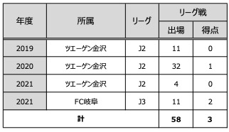 J2リーグ 47試合(1得点) / J3リーグ 11試合(2得点)