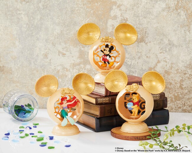ディスプレイの中心部にセットするフィギュアは、各キャラクターの世界観が伝わる動きのあるポーズになっており、「ミッキーマウス」は右手を上げ左手を腰に当てているポーズ、「くまのプーさん」はハニーポットを抱えているポーズ、「アリエル」は左手を伸ばしているポーズで海中で髪がなびいているシーンを切り取っています。