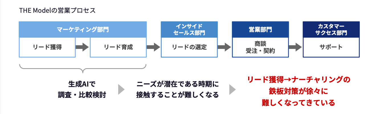 BtoBマーケティングにおける「リードを獲得し、ナーチャリング(顧客育成)を経て商談化する」というTHE Model型のフローは、顧客との接点があることを前提としています。