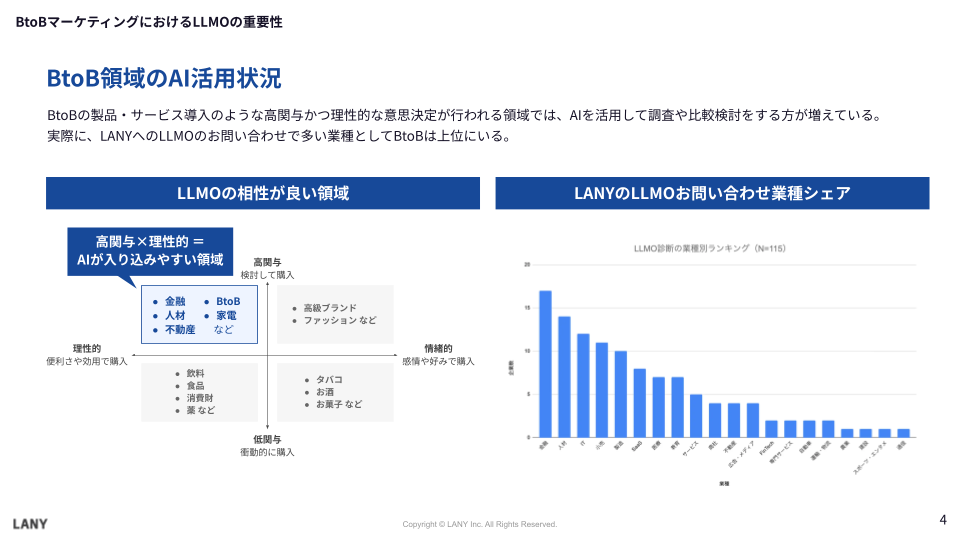 株式会社LANY(レイニー/本社:東京都渋谷区、代表取締役:竹内渓太)は、BtoB企業向けにAI検索対策をまとめた資料『BtoBのLLMOガイドブック』をリリースしました。