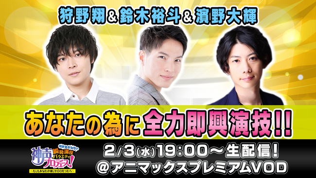 視聴者参加型の瞬発演技バラエティ『神声プロデュース!』〜もしも あなたの推しが〇〇だったら〜出演:狩野翔、鈴木裕斗、濱野大輝!2月3日(木)19:00から生配信!
