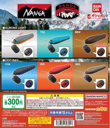 株式会社バンダイ ベンダー事業部(本社:東京都台東区)は、株式会社ナンガ(本社:滋賀県米原市)が展開するダウンシュラフの人気モデル「AURORA LIGTHT」「UDD BAG」をミニチュア化した『NANGA ミニチュアシュラフチャーム』(1回300円・税10%込、全6種)を2024年10月第5週より全国のガシャポンバンダイオフィシャルショップ、玩具売場、量販店、家電店などに設置されたガシャポン自販機シリーズにて発売いたします。