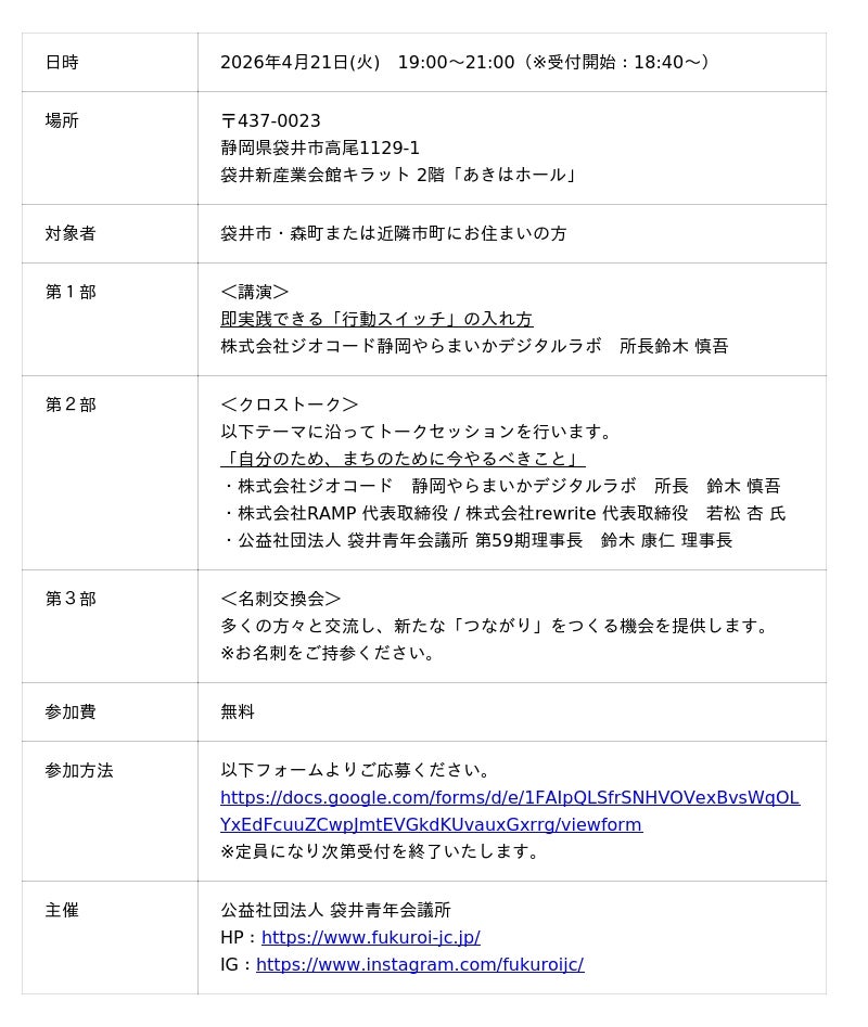 Webマーケティングとクラウドセールステック事業を展開する株式会社ジオコード(本社:東京都新宿区、代表取締役:原口 大輔、証券コード:7357)は、2026年4月21日(火)に公益社団法人 袋井青年会議所が主催する「発見!繋がる!!異業種交流会」において、静岡やらまいかデジタルラボ所長の鈴木慎吾が登壇・講演することをお知らせします。