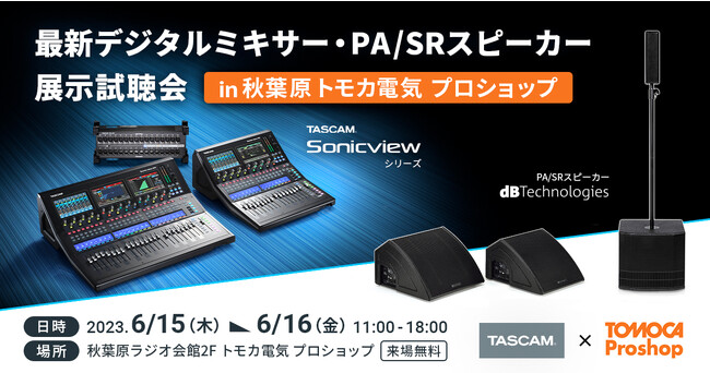 ティアック株式会社 (本社:東京都多摩市、代表取締役社長:英 裕治) は、2023年6月15日 (木) 〜6月16日 (金) に東京都千代田区外神田にあるトモカ電気株式会社直営のプロオーディオ専門店プロショップにて、TASCAMの新製品デジタルミキサーおよびdBTechnologiesブランドの PA/SRスピーカーの展示試聴イベント「【出張】TASCAM Sonicview × dBTechnologies展示試聴会 in トモカ電気 プロショップ」を開催いたします。