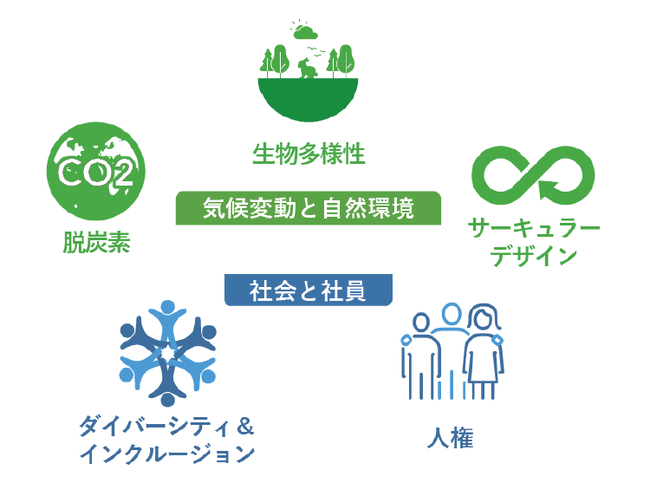 2050年のサステナビリティポリシーを実現するために、2030年までに特に取り組むべき重点課題として、「ダイバーシティ&インクルージョン」、「人権」、「脱炭素」、「生物多様性」、「サーキュラーデザイン」の5つを特定いたしました。※1