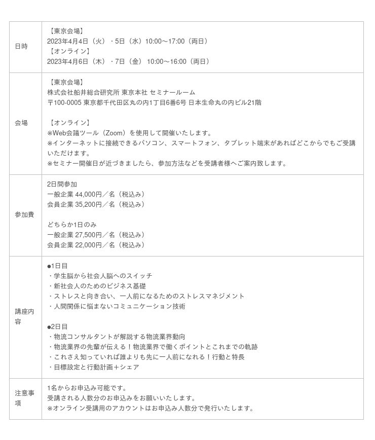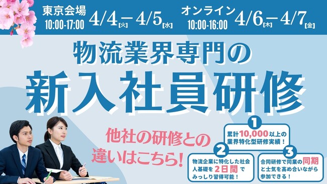 ロジスティクス・物流コンサルティングサービスを提供する船井総研ロジ株式会社(東京本社:東京都千代田区、代表:菅重宏、以下「船井総研ロジ」)は、2023年4月4日(火)・4月5日(水)10:00〜17:00に東京会場、4月6日(木)・4月7日(金)10:00〜16:00にオンラインにて、物流業界特化型の新入社員研修を開催いたします。