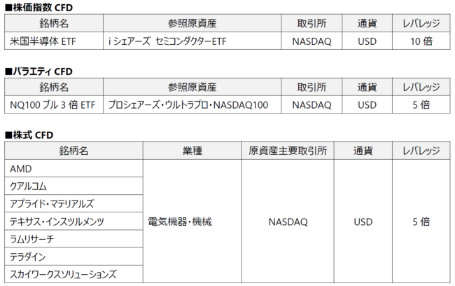 ICE半導体指数(米国の半導体指数)に連動する投資成果を目指すETFが参照原資産の株価指数CFD「米国半導体ETF」の追加をはじめ、米半導体メーカー大手の「AMD」や「クアルコム」などを含む米国株CFDを7銘柄追加しました。さらに、当社で人気の米国NQ100に関連した「NQ100ブル3倍ETF」を追加!これにより、当社のCFD取引の取扱銘柄数は148銘柄となります。この機会に、魅力的な銘柄が豊富に揃うCFD取引をぜひお試しください。