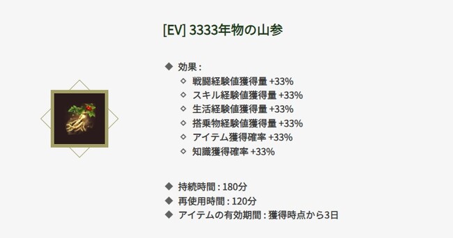 イベント期間中、採集を行うと「[EV] 3333年物の山参」を獲得することができます。商店で販売することもできますが、バフアイテムとしても活用できますので、お役立てください。