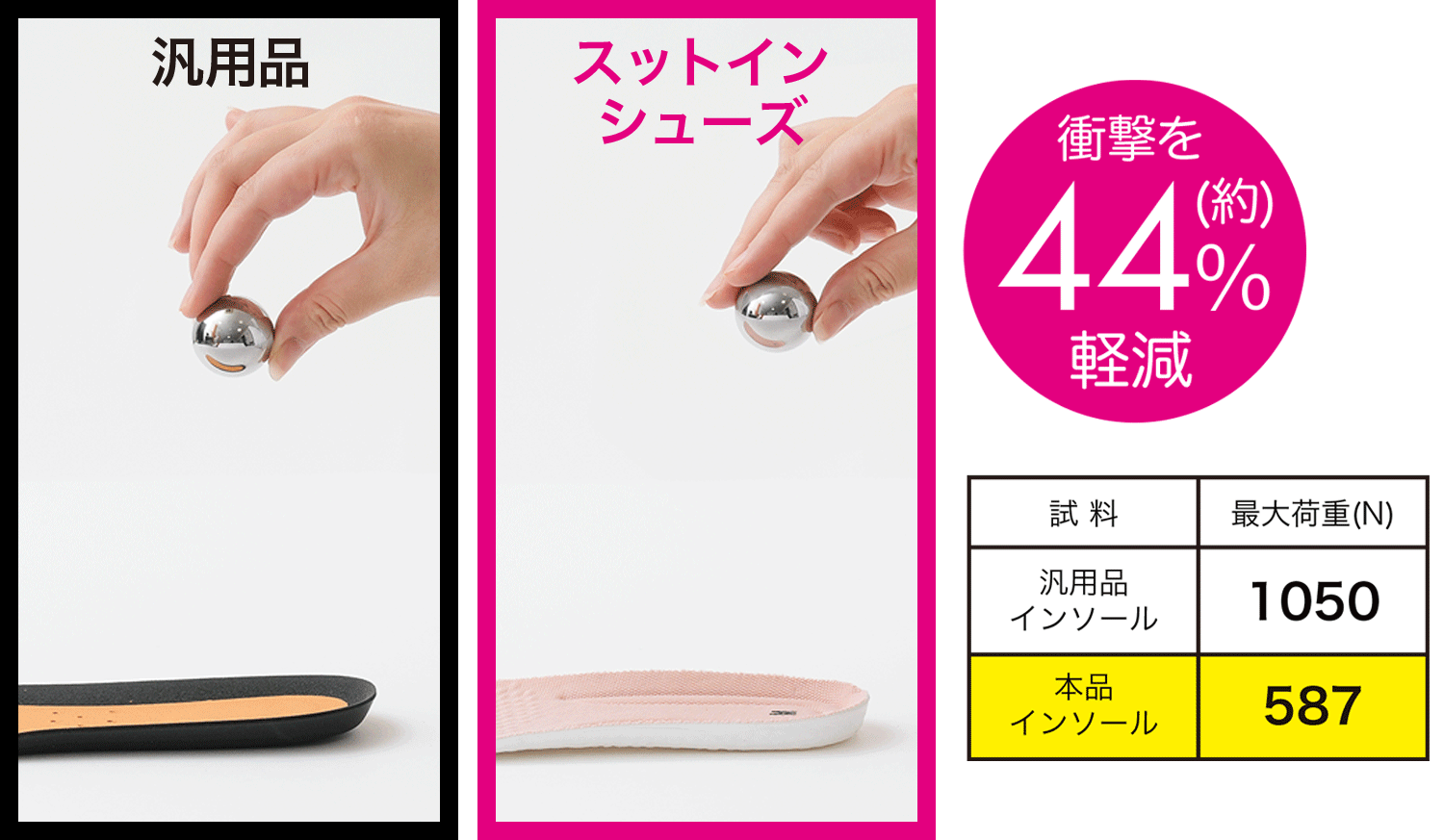 自社一般汎用品とスットインシューズのインソールを比較して、衝撃吸収性のテストをしたところ、こんな結果に!